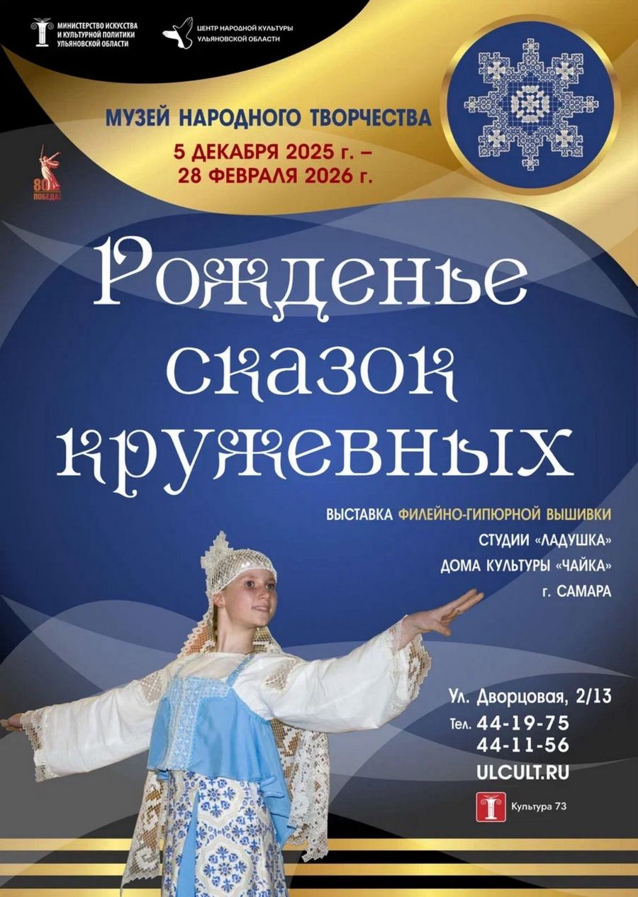 До 28 февраля в Музее народного творчества открыта выставка самарской филейно-гипюрной вышивки «Рожденье сказок кружевных». Показаны работы мастера Ольги Якуниной и её учениц. В их числе — вышитые костюмы, филейно-гипюрные изделия, панно «Кружевные круги» и «Самарские мотивы», а также реплики работ Народного мастера России Надежды Тазовой.